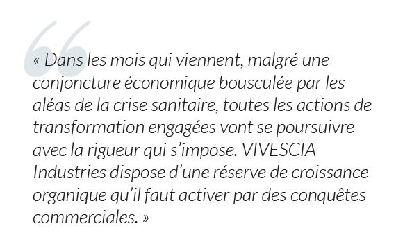 J’ai placé l’exercice 2019-2020 sous le signe de l’exigence et de la reconquête : ce fut bien le cas et c’est une satisfaction. Un travail sérieux de redressement énergique a été conduit, plus particulièrement sur le périmètre des activités de Boulangerie-Viennoiserie-Pâtisserie (BVP). VIVESCIA Industries a véritablement ouvert une nouvelle page, sous l’impulsion et l’engagement remarquable de son nouveau dirigeant, Olivier Miaux.